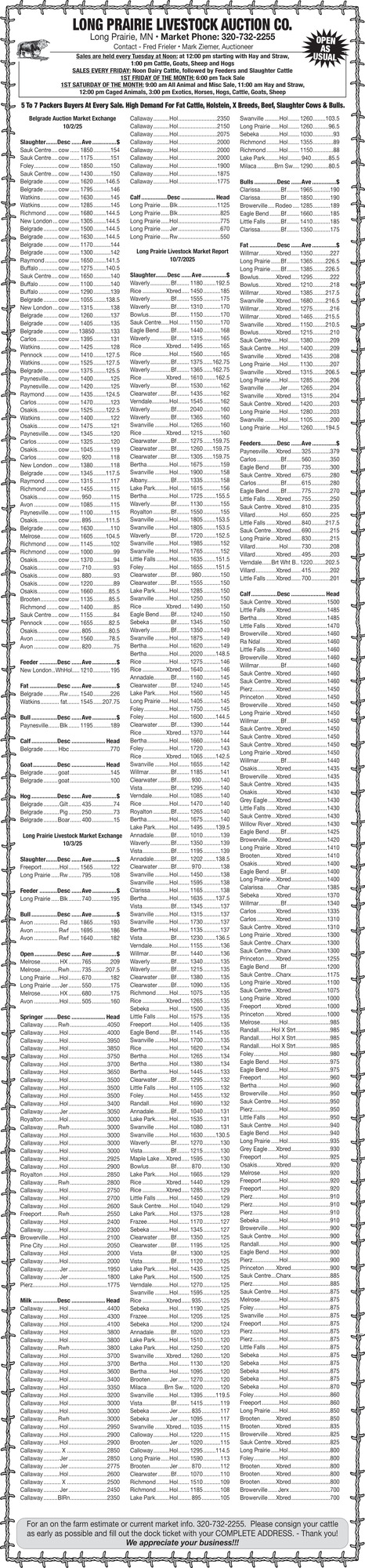 Oct 12, 2025. Long Prairie Livestock Auction Co Livestock Ads from Morrison County Record