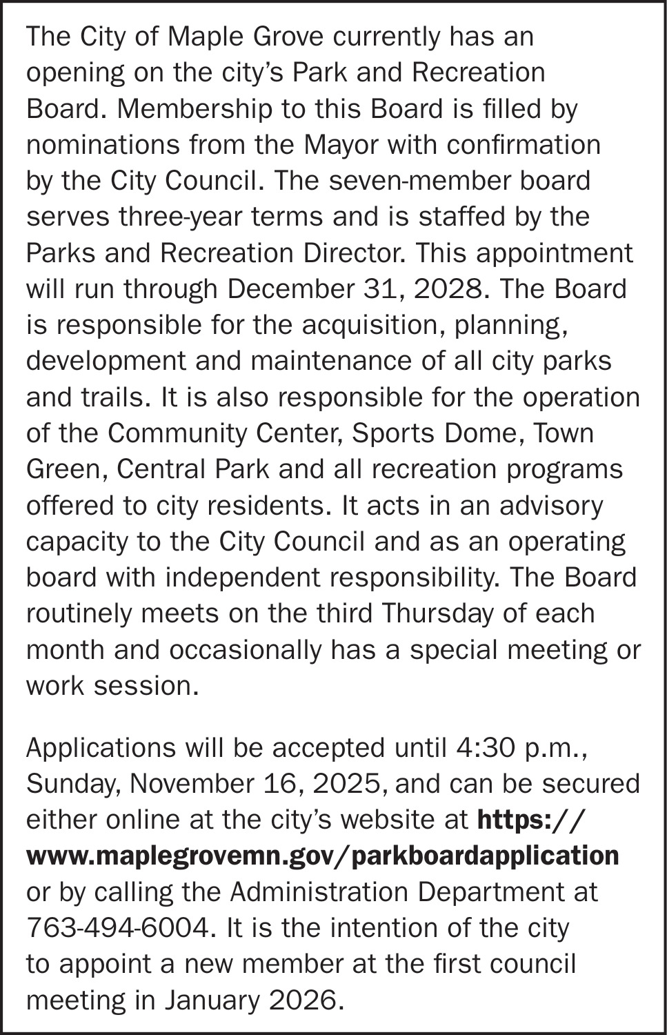Oct 29, 2025. The City Of Maple Grove Announcement Ads from Press & News