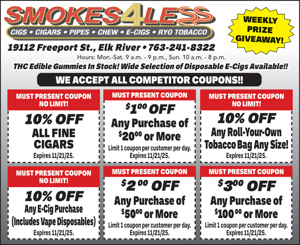 763-241-832219112 Freeport St,Elk River, MN 55330(Smokes 4 Less)