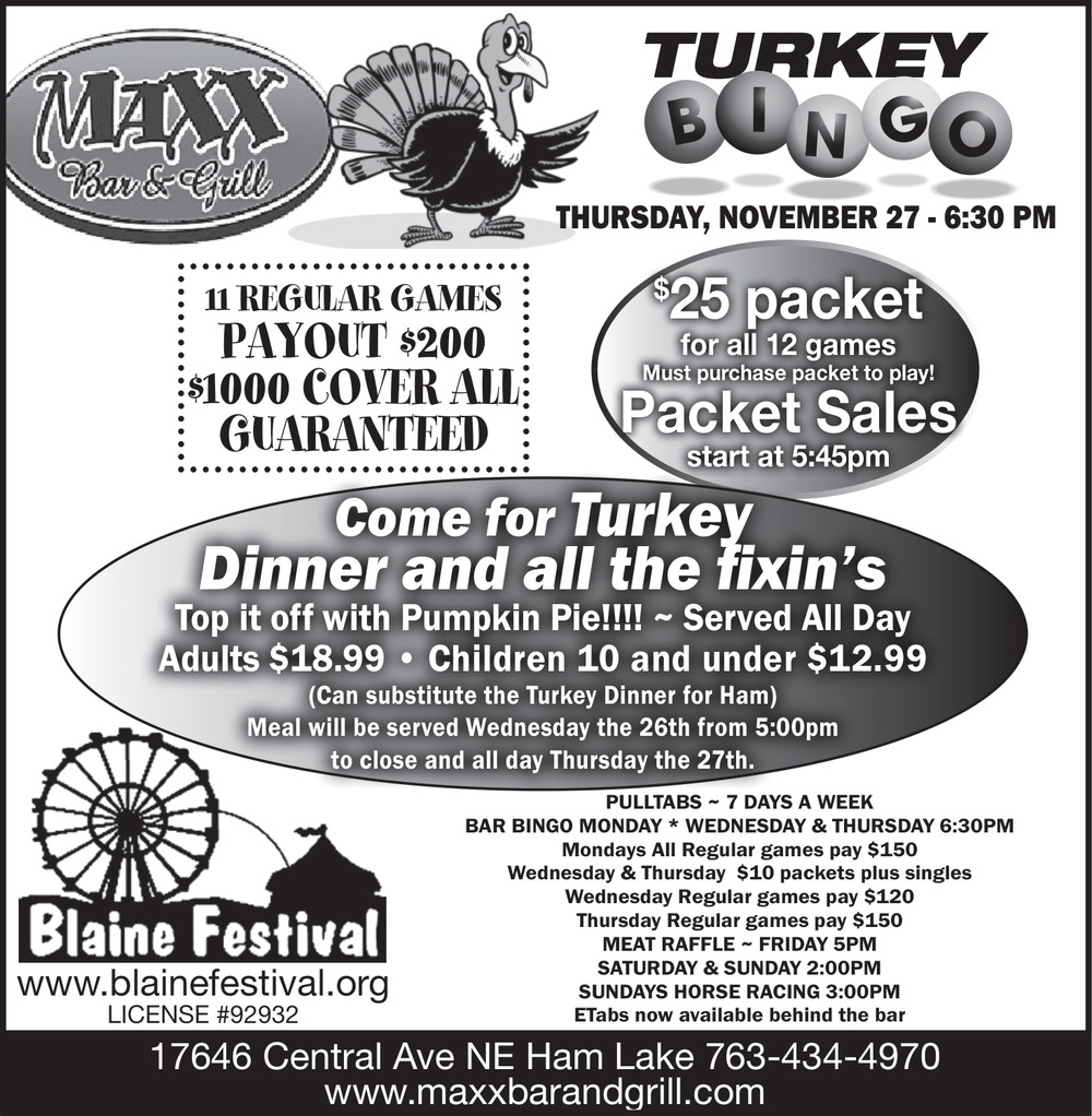 Nov 16, 2025. Maxx Bar And Grill - Blaine Festival Events Ads from County News Review