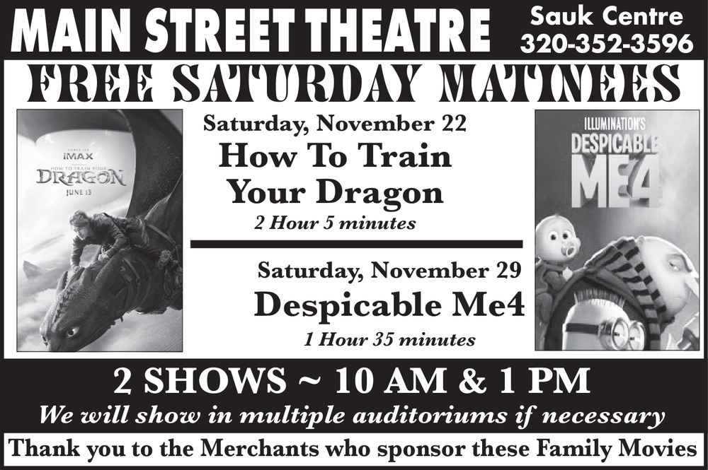 Nov 23, 2025. Main Street Theatre - Sauk Centre Shows & Theater Ads from Dairyland Peach