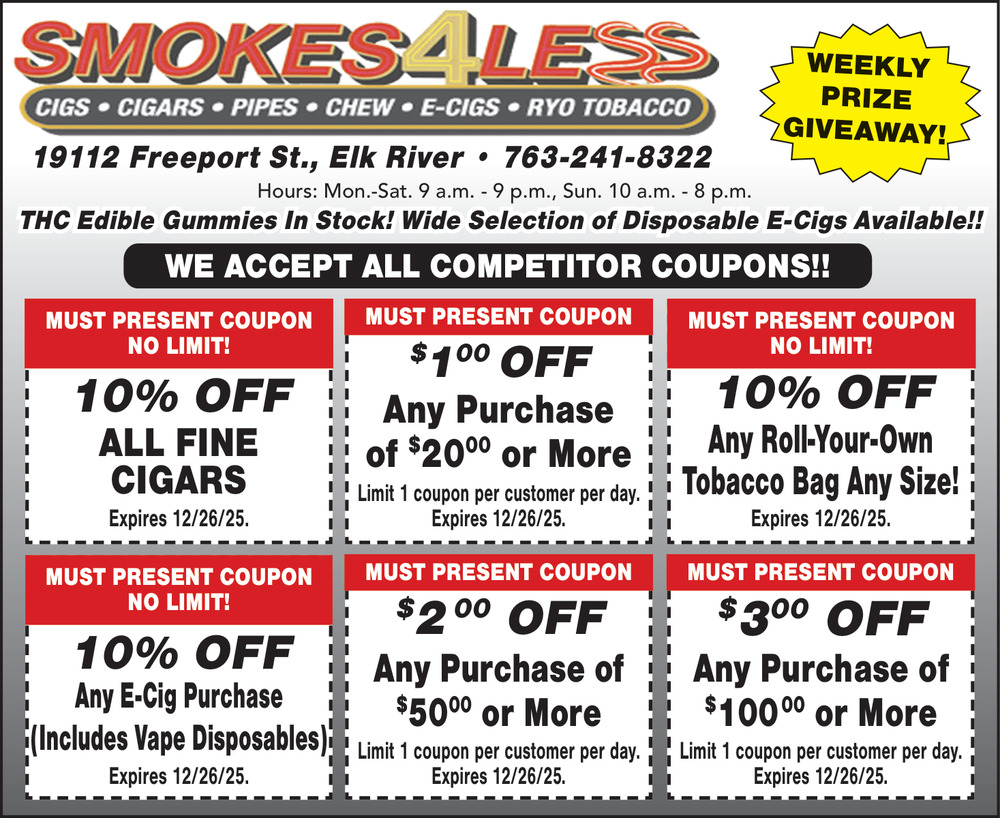 763-241-832219112 Freeport St,Elk River, MN 55330(Smokes 4 Less)