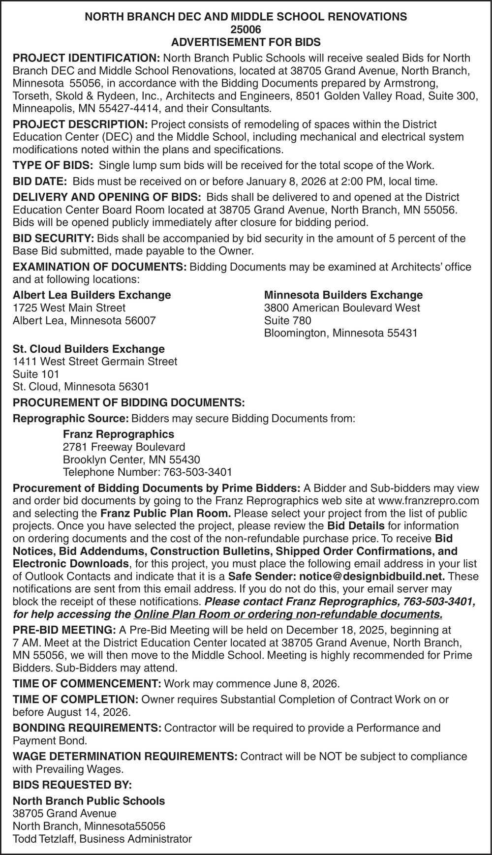 Dec 21, 2025. North Branch Area Public Schools Education Ads from County News Review