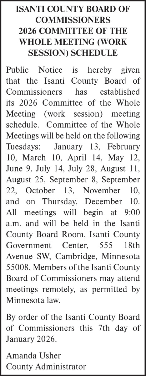 Jan 18, 2026. Isanti County Government Ads from County News Review