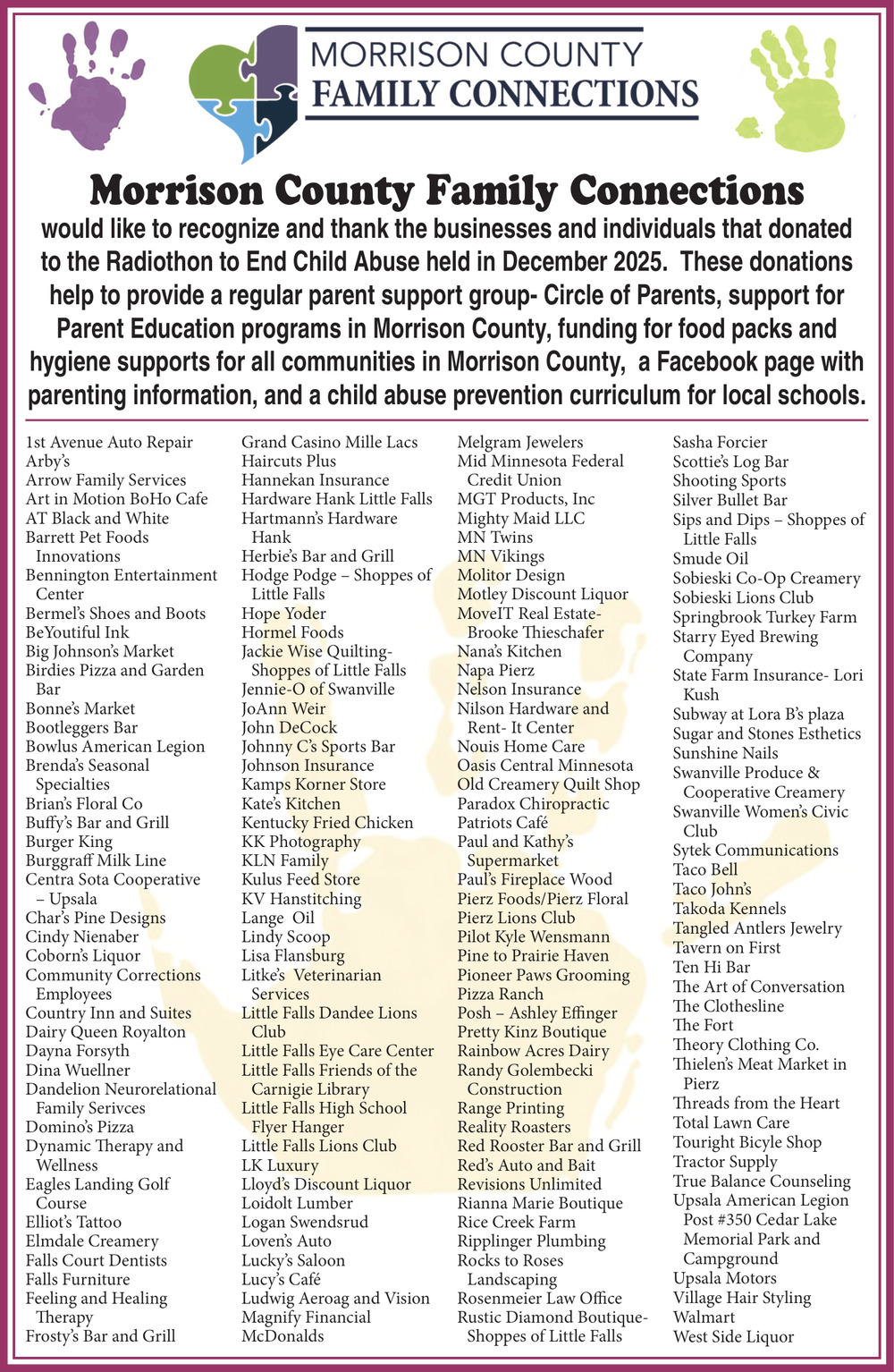 We Would Like to Recognize and Thank the Business ans Individuals that Donated to the Radiothon to End Child Absuse Held in December 2025