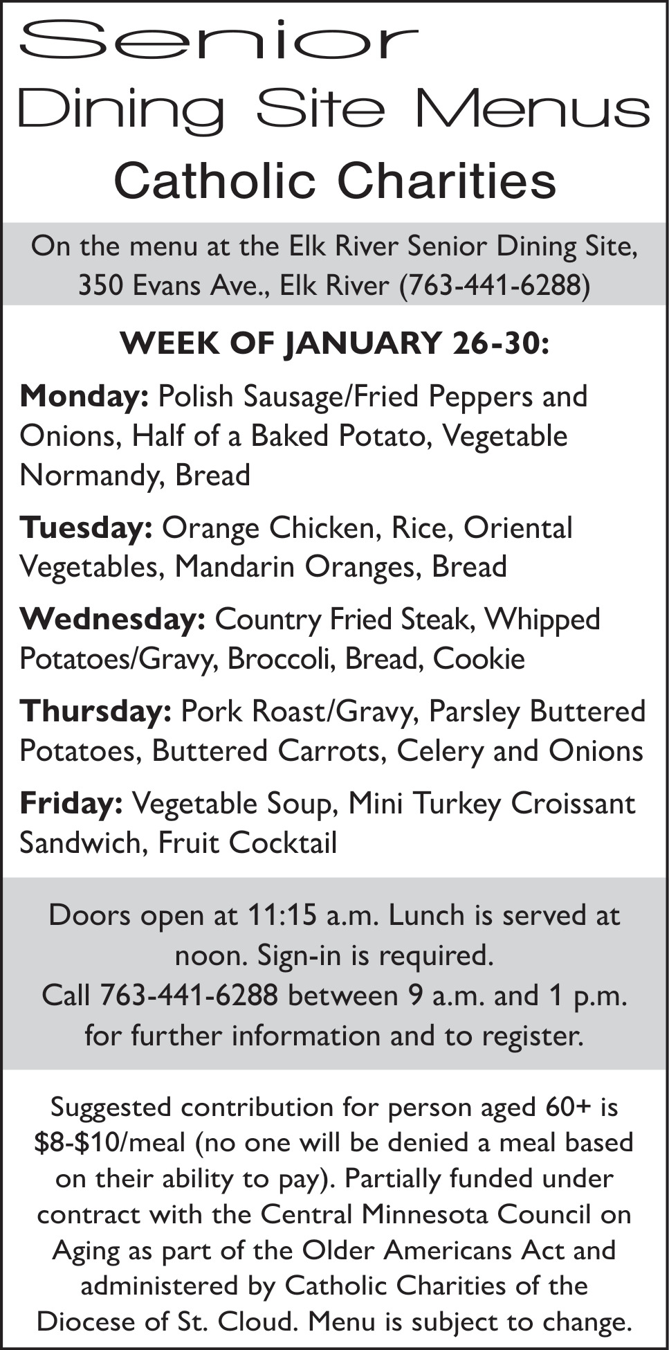 Ads for Senior Dining Site Menus Catholic Charities in Elk River, MN