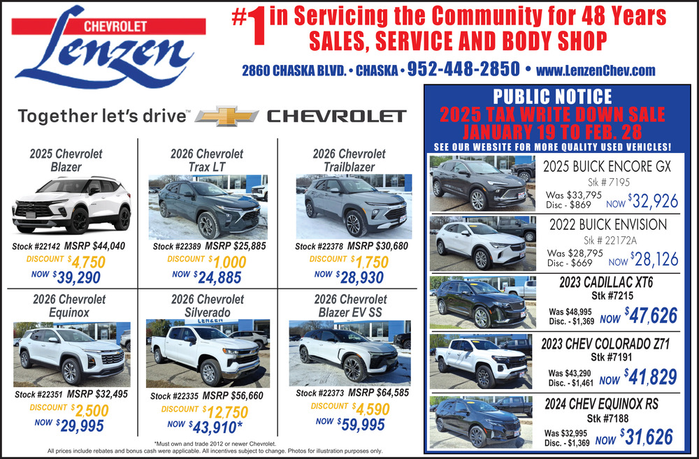 Jan 24, 2026. Lenzen Chevrolet Buick, Inc Auto Dealers Ads from Laker & Pioneer