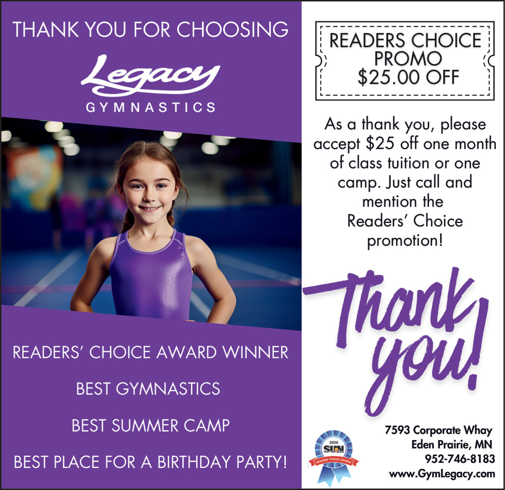 Ads for Legacy Gymnastics in Eden Prairie, MN