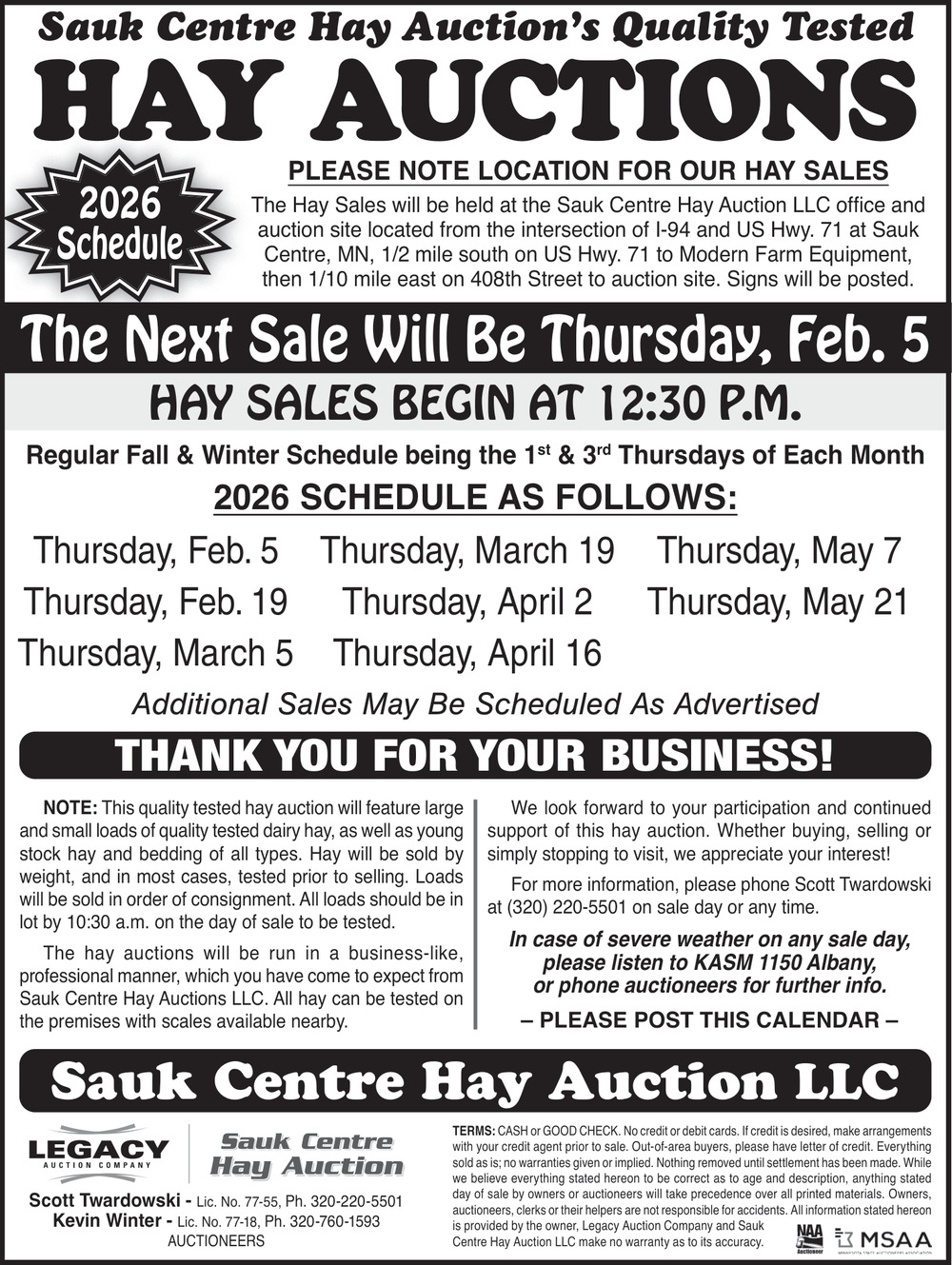 Feb 01, 2026. Sauk Centre Hay Auction Auction Ads from Dairyland Peach