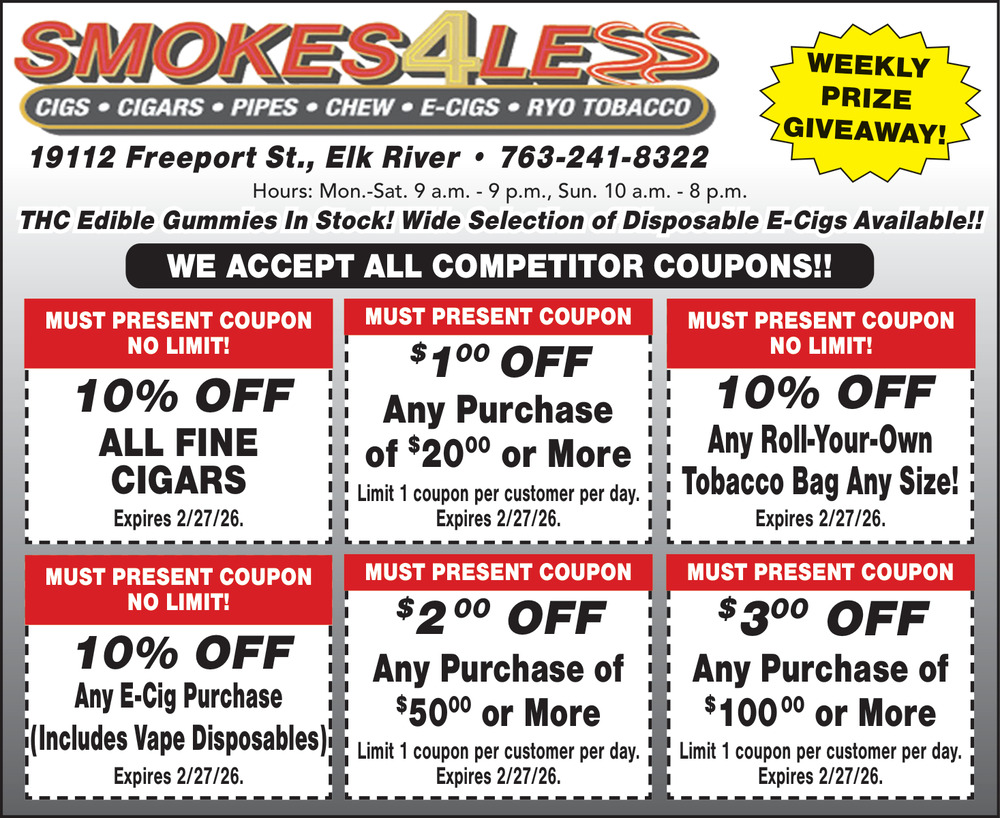 763-241-832219112 Freeport St,Elk River, MN 55330(Smokes 4 Less)