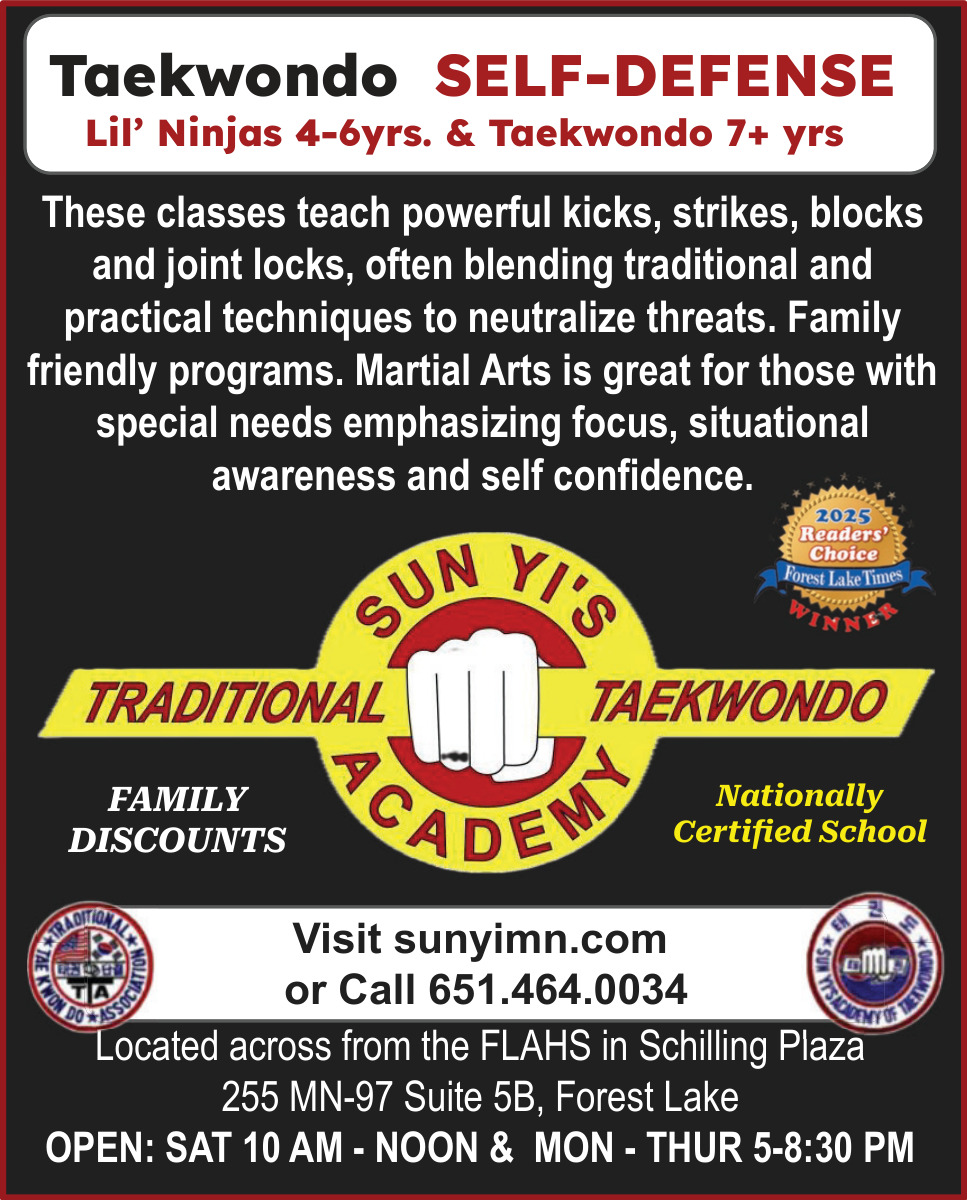 Feb 22, 2026. Sun Yi's Traditional Taekwondo Academy Sports Ads from Forest Lake Times