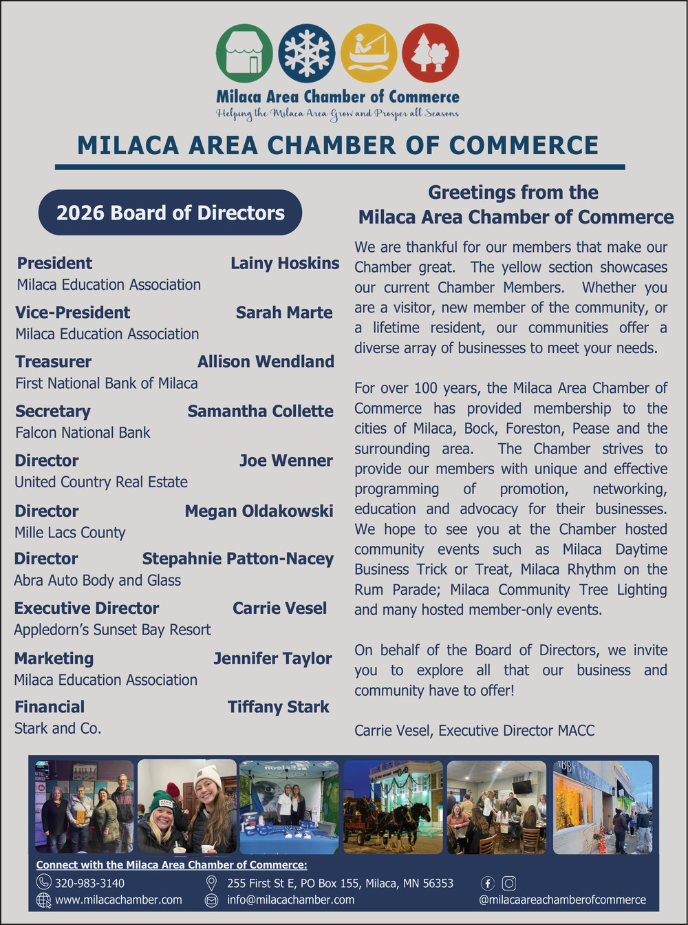 Mar 08, 2026. Milaca Area Chamber of Commerce Chamber of Commerce Ads from County News Review