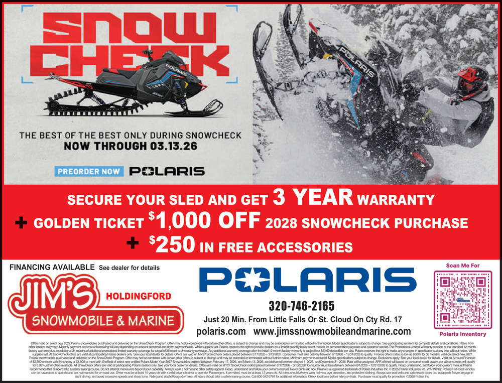 Mar 08, 2026. Jim's Snowmobile & Marine Inc Vehicle Services & Repair Ads from Morrison County Record