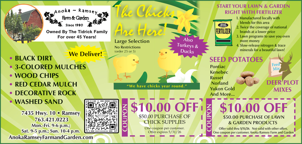 Apr 01, 2026. Anoka-Ramsey Farm & Garden Home & Garden Ads from ABC Newspapers