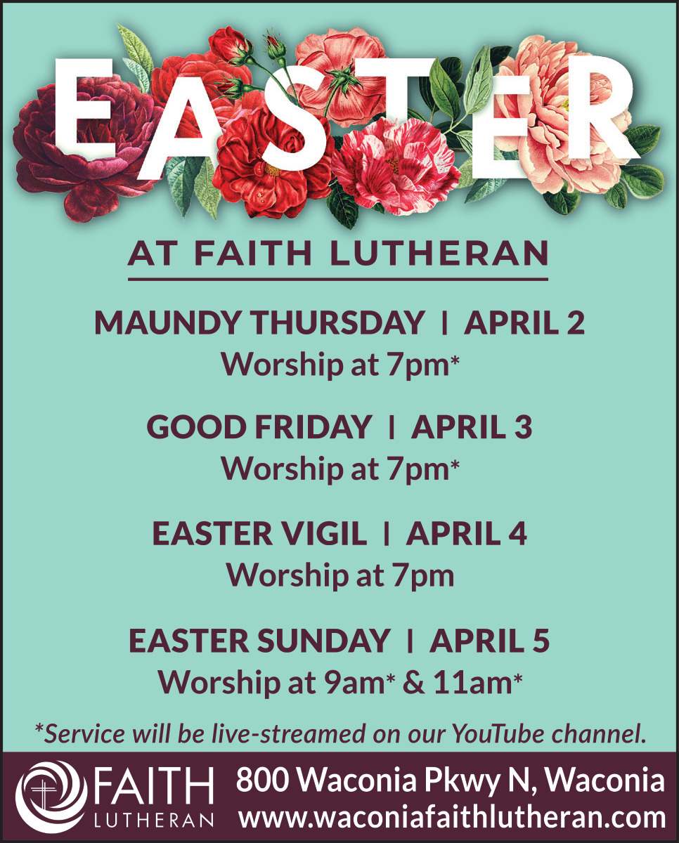Apr 02, 2026. Faith Lutheran Church - Waconia Church Ads from Sun Patriot
